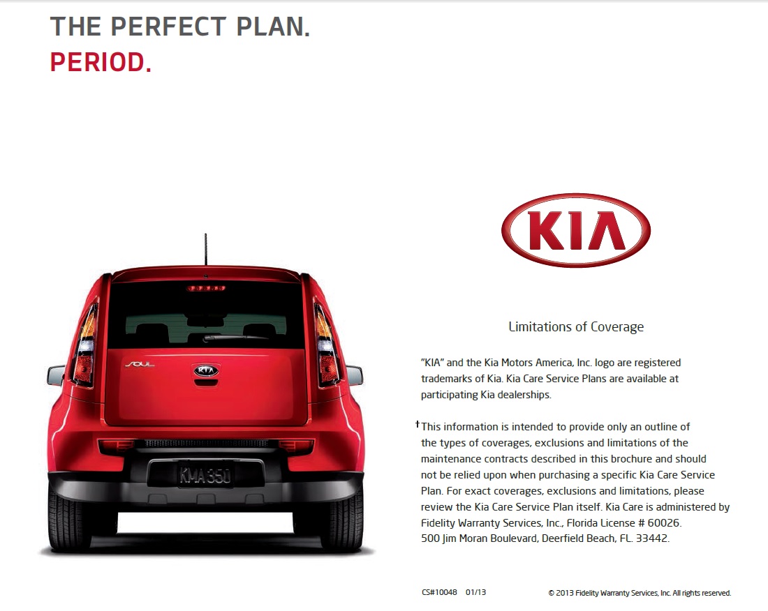 Brochure and should not be relied upon when purchasing a specific service contract. exclusions and limitations, please review the limited warranty itself. The Kia Certified Pre-Owned Plan is administered by Fidelity Warranty Services, Inc. Florida License #60026. 500 Kia Care Plans ... Return Document